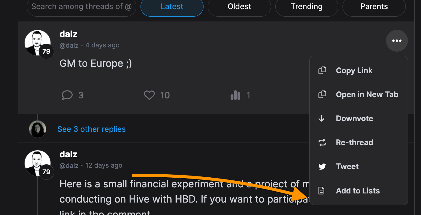 I created a List called "stats" and I want to add users to it who regularly post stats on Hive. I'll start by adding @dalz to this list. I searched up his username. Now all I need to do is find any thread created by him and click the "3 dots" menu. Then click "Add to Lists"